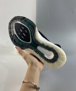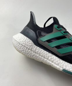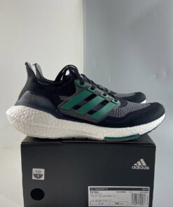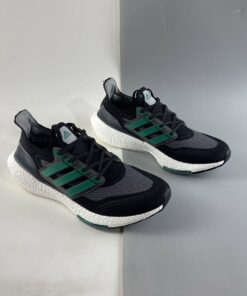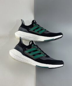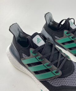 This adidas Ultra Boost 2021 is made with Primeblue, a high-performance recycled material made in part with Parley Ocean Plastic. 50% of the upper is textile, 75% of the textile is Primeblue yarn. Additional details includes Green Three Stripes, Grey toes atop a White Boost midsole and semi-translucent Continental rubber outsole.