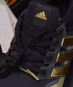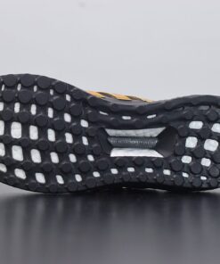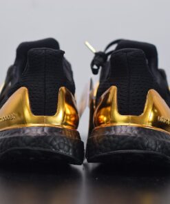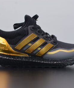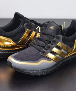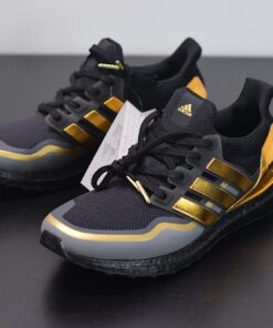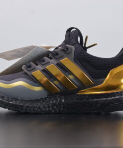 This adidas Ultra Boost features a Black Primeknit upper with Grey overlays used as the mudguard. Highlighting the shoe are Gold accents on the Three Stripes and heel counter atop a Black Boost midsole and rubber outsole.