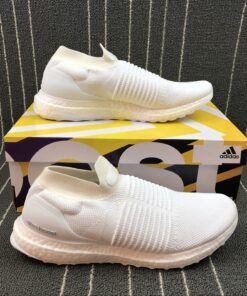 While being a new Laceless silhouette it also comes with an Uncaged construction. Built with a full White Primeknit upper and a ribbed texture on the midfoot. Its sock-like collar and matching full-length Boost midsole completes the clean design.