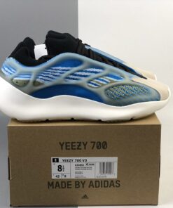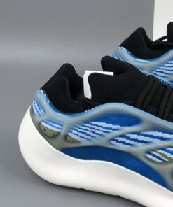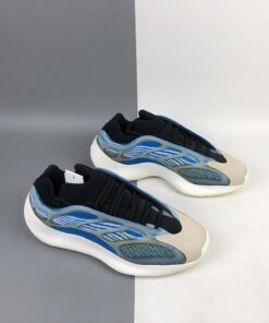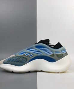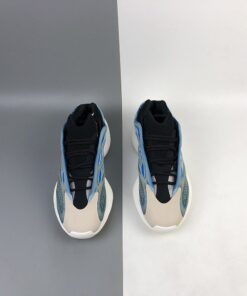This offering of the adidas Yeezy 700 V3 features a Blue-based Primeknit upper paired with Dark Green and Grey accents along with a translucent glow-in-the-dark cage overlay. The model also replaces Boost cushioning with an EVA foam midsole.