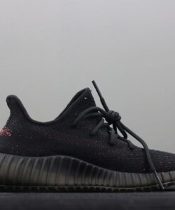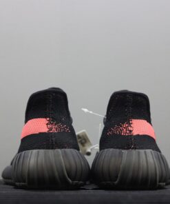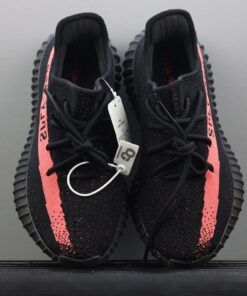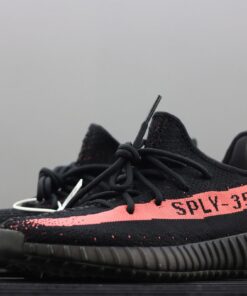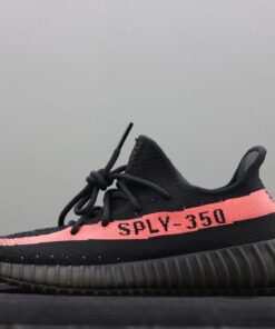 This adidas Yeezy 350 Boost V2 features a full Black Primeknit upper with a Bright Red stripe across the lateral side. A Black SPLY-350 overlays the stripe, while sitting atop a Black rubber sole with Boost appearing on the outsole.