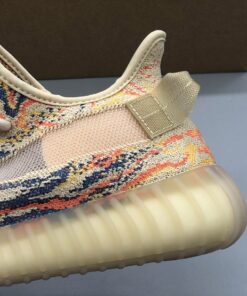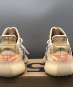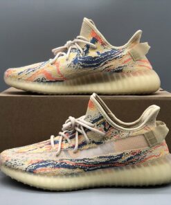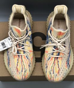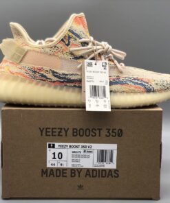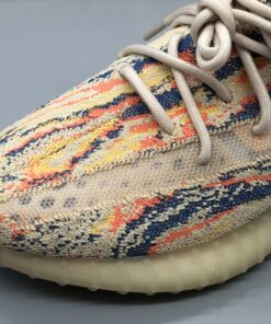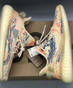 This offering of the adidas Yeezy Boost 350 V2 features a Buttery Yellow Primeknit upper covered in a swirling pattern of Orange, Blue, and Golden Yellow tones. Other details includes a translucent stripe on the lateral side along with a pull tab on the heel. A translucent Boost-cushioned sole completes the design.