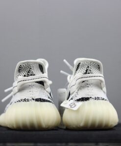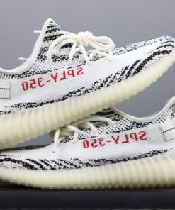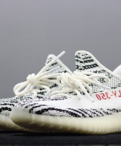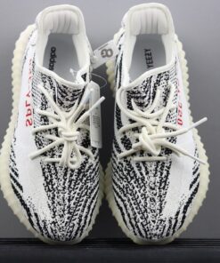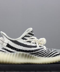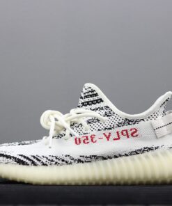 Dressed in a Zebra-like color scheme. This adidas Yeezy 350 Boost features a Black and White Primeknit upper with a Red SPLY-350 letting and stitching on the back pull-tab. A Boost midsole completes the Yeezy design.