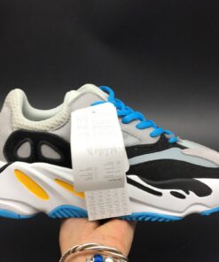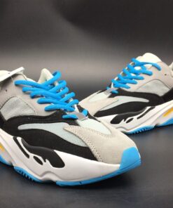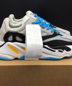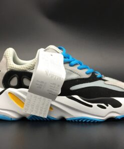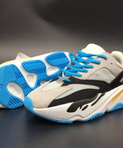 To be specific, this adidas Yeezy Boost Wave Runner 700 comes dressed in a Navy, Cream, Yellow, White, Black and Light Blue color combination. As for the construction, we have suede on the overlays while leather lands on the eyestays and mesh wraps the heel and collar. Following we have the unique midsole which features Boost while Black covers the outsole to complete the look.