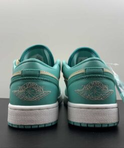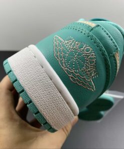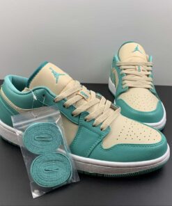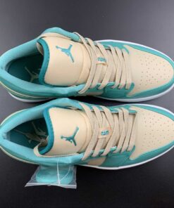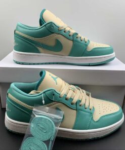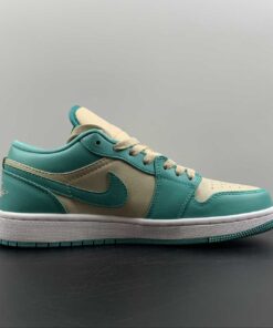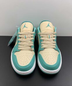 Step up your sneaker game with the Air Jordan 1 Low Beige Teal Green. These stylish and versatile sneakers feature a classic low-top silhouette with a beige and teal green colorway that will add a pop of color to any outfit. The iconic Air Jordan branding and comfortable cushioning make these shoes perfect for everyday wear. Don’t miss out on the chance to add these must-have kicks to your collection. Get your pair now!