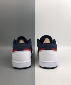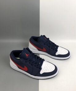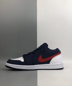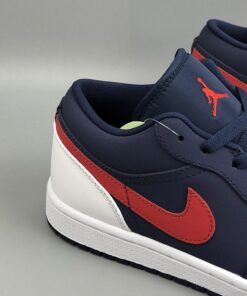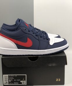 Step up your sneaker game with the Air Jordan 1 Low “USA” in a classic navy blue, white, and red colorway. These iconic sneakers feature the signature Air Jordan design with a low-top silhouette for a sleek and stylish look. Perfect for everyday wear or to add a pop of color to your outfit, these Air Jordans are a must-have for any sneakerhead. Get your hands on a pair today and show off your patriotic style.