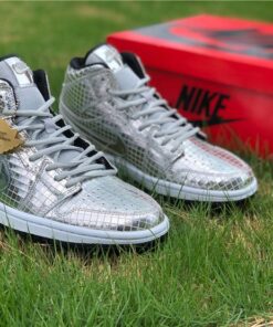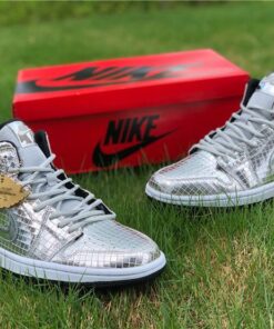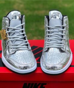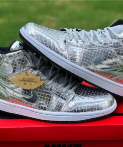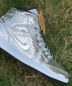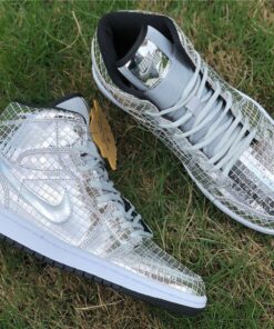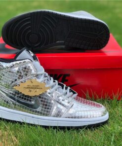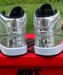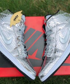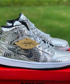 Step up your sneaker game with the Air Jordan 1 Mid “Disco Ball” in Metallic Silver/Black-White. These eye-catching kicks feature a shiny disco ball-inspired design that is sure to turn heads wherever you go. With the iconic Air Jordan 1 silhouette and a comfortable mid-top fit, these sneakers are perfect for both style and performance. Don’t miss out on adding these unique and stylish shoes to your collection. Get your pair now!