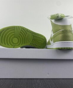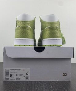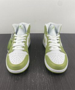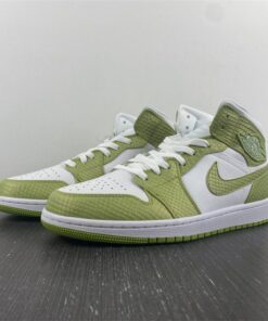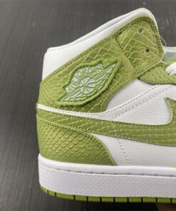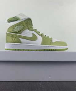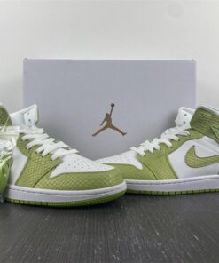 Step up your sneaker game with the Air Jordan 1 Mid ‘Green Python’ in White/Vivid Green. These stylish kicks feature a unique green python print on the overlays, giving them a bold and eye-catching look. The classic Air Jordan 1 silhouette is updated with a fresh colorway that is sure to turn heads. Whether you’re hitting the court or hitting the streets, these sneakers will keep you looking fly. Don’t miss out on adding these must-have shoes to your collection. Get your pair today!