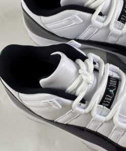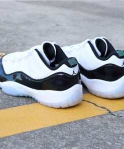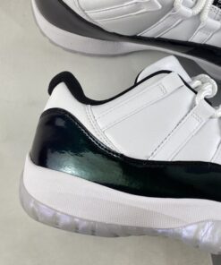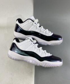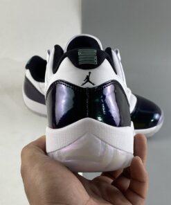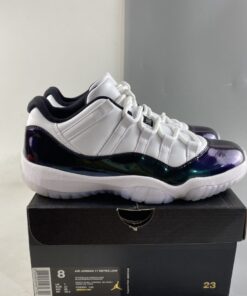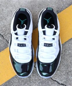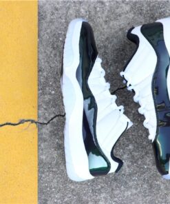 Dressed in a White, Emerald Rise and Black color scheme. This low-top Air Jordan 11 features an Emerald Green iridescent patent leather to give off that Easter vibe. Additional details includes a White upper, Black detailing atop an iridescent translucent outsole.
