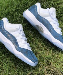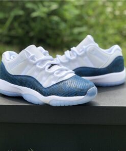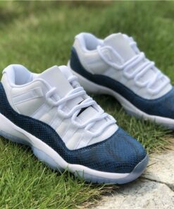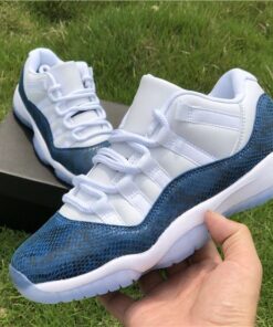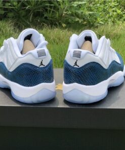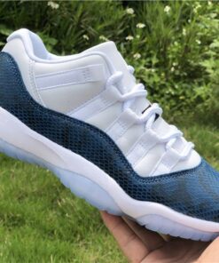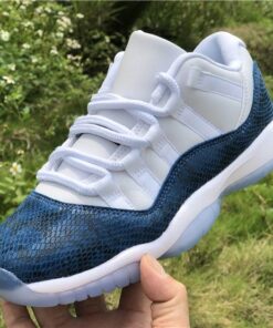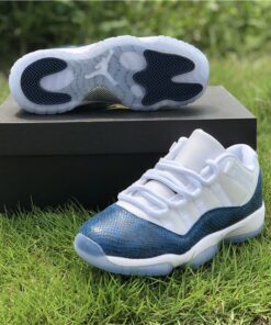 This release of the Air Jordan 11 Low features a White leather upper wrapped in Navy Blue snake-textured leather. A White midsole and an icy translucent outsole completes the design.