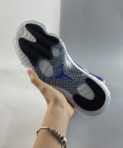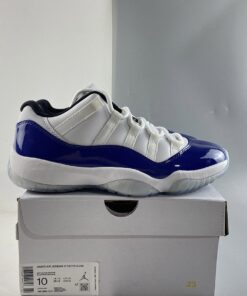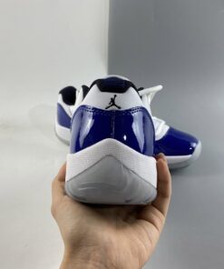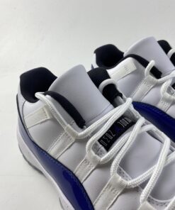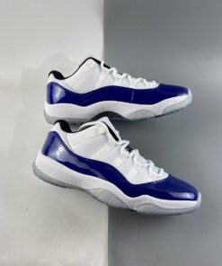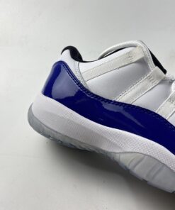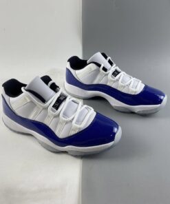 Dressed in a White, Black, and Concord color scheme. This low-top Air Jordan 11 features a White upper with Concord patent leather overlays, a Black liner atop a translucent outsole.
