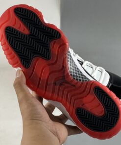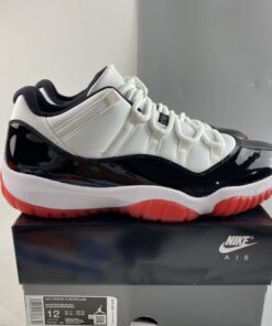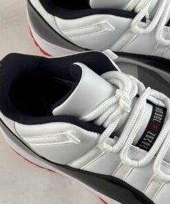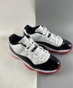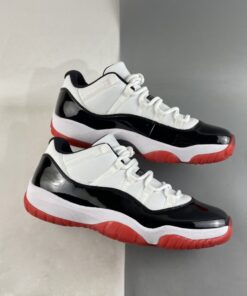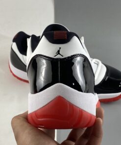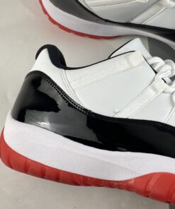 Dressed in a White, University Red, Black, and True Red color scheme. This Air Jordan 11 Low features a White leather upper with a Black patent leather mudguard atop a Red translucent outsole.