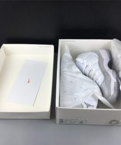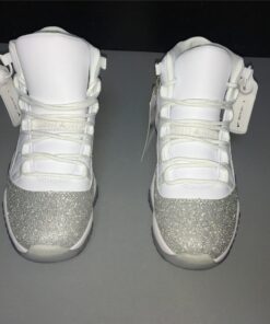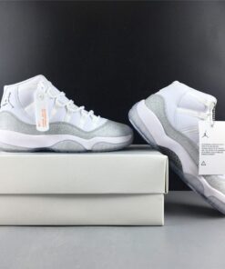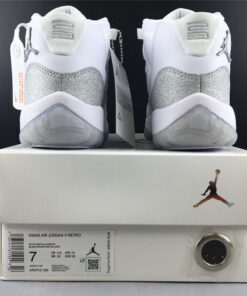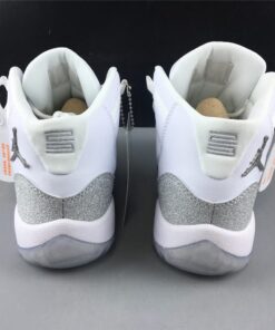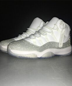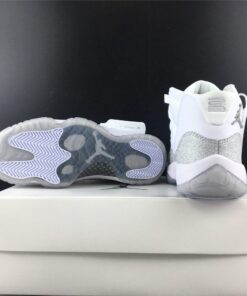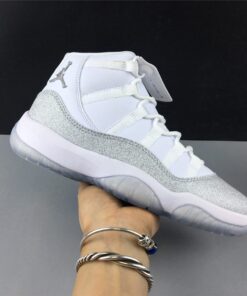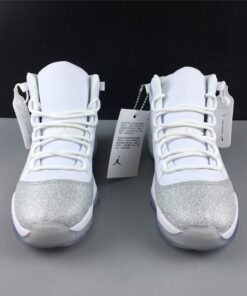 Dressed in a White, Metallic Silver, and Vast Grey color scheme. This Air Jordan 11 features a White upper with a shiny Silver-encrusted finish replacing the traditional glossy patent overlay adding for a nice luxurious touch. A White midsole atop a translucent outsole completes the design.