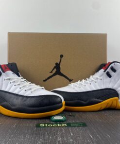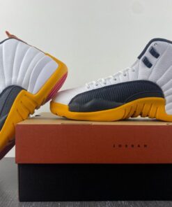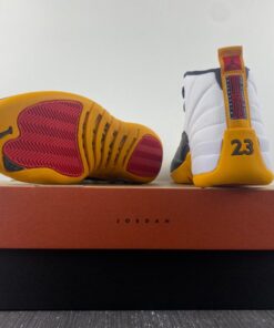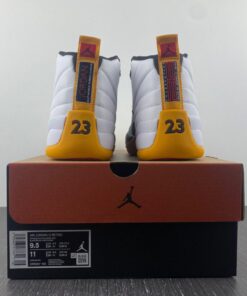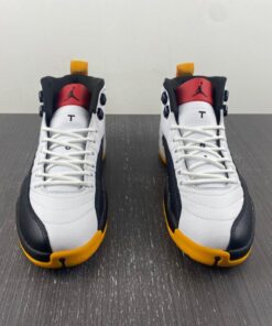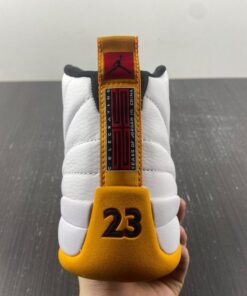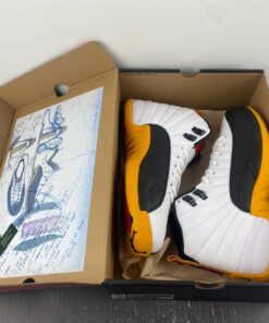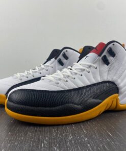 Dressed in a China-friendly White, Black, Taxi, and Varsity Red color scheme. This offering of the Air Jordan 12 features a White leather base with Black mudguards, Red tongues atop a Yellow (Taxi) outsole with Red traction pods. “Celebrating 25 Years of Jordan in China” replacing the “Jordan” on the right heel tab with graphic sketch insoles completes the design.