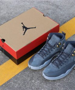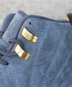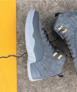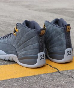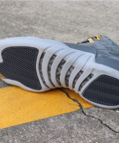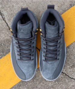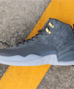 this Air Jordan 12 comes dressed in a Dark Grey and Wolf Grey color combination. Utilizing Dark Grey on the suede uppers and leather basketball textured overlay. Following we have Wolf Grey applied to the Jumpman branding, Two 3 running down the tongue and outsole. Completing the look while giving them a premium theme is Metallic Gold on the top two eyelets and the top of the back heel pull tabs which is a nod to the ‘Taxi’ Air Jordan 12.
