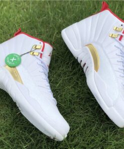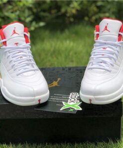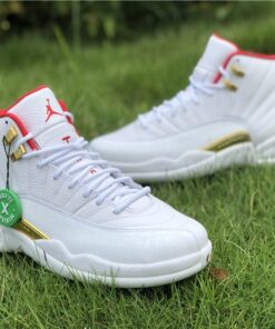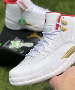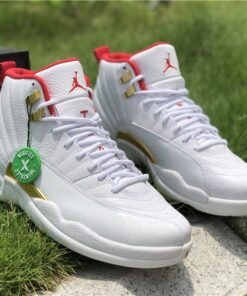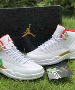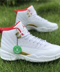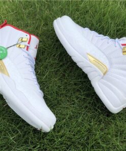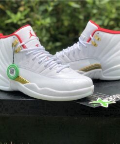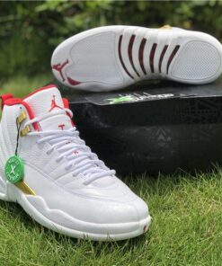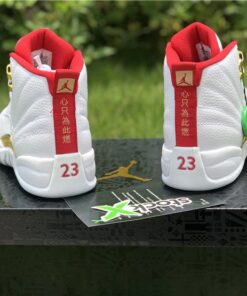 Dressed in a White, University Red, and Metallic Gold color scheme. This Air Jordan 12 features a White leather upper detailed with different symbols from flags. Red accents, Metallic Gold detailing with Chinese text on the heel tab completes the design.