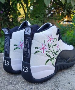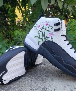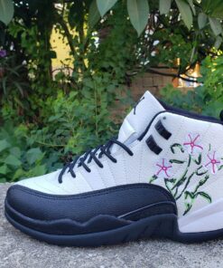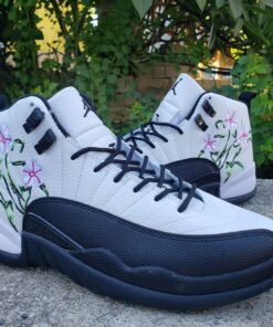 Dressed in a White, Black, Vivid Green, Lavender Mist, and Team Green. This offering of the Air Jordan 12 features a classic White and Black leather build detailed with a floral print embroidered on the heels. A Black and Lavender rubber sole completes the design.