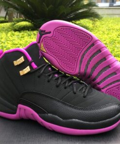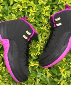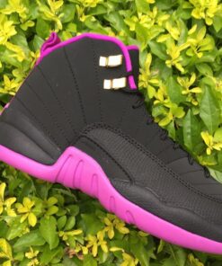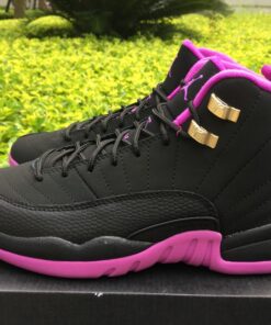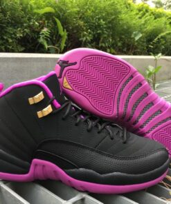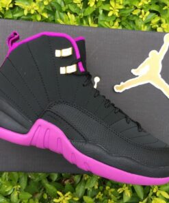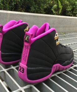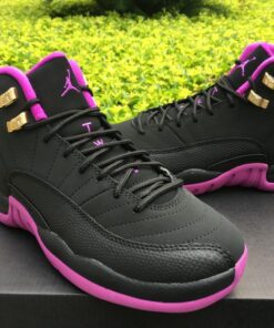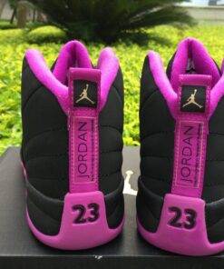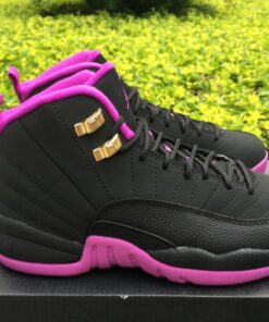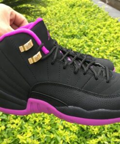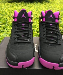 Dressed in a Black, Metallic Gold Star and Hyper Violet color scheme. This Air Jordan 12 features a full Black-based upper that dons minor hints of Metallic on the metal lace loops that’s accented with Hyper Violet Purple on the tongue, inner liner, back heel and outsole.
