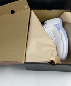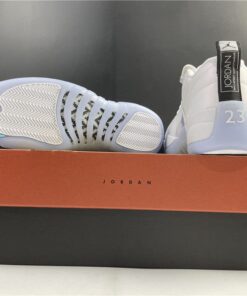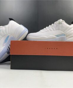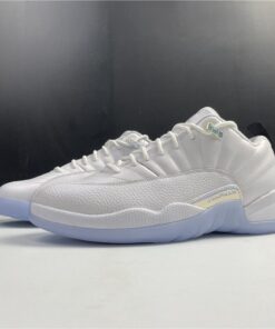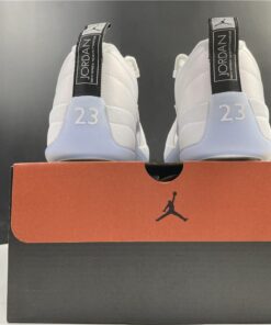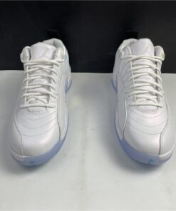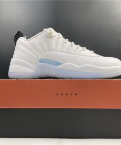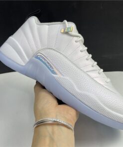 Dressed in a White and Multi-Color color scheme. This low-top Air Jordan 12 features a White leather upper paired with matching overlays, embroidered tongue branding, and laces. A Black heel tab, iridescent eyelets and side panels atop an icy outsole completes the design.