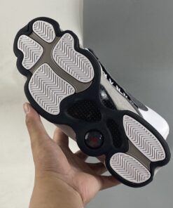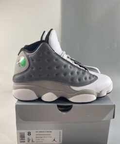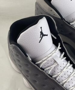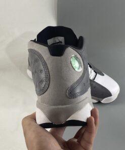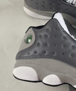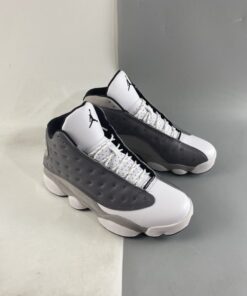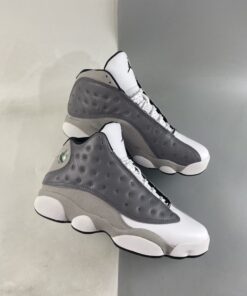 Dressed in a Atmosphere Grey, White, University Red and Black color scheme. This Air Jordan 13 features a Dark Grey leather upper with a lighter shade of Grey on the mudguard and riding up the heel. A White leather toe, Black lining, Red accents and the models signature hologram heel logo completes the design.