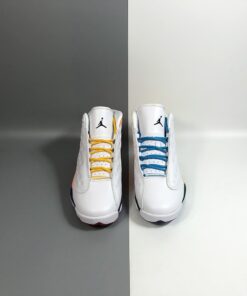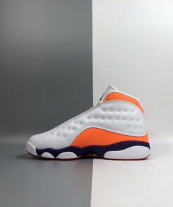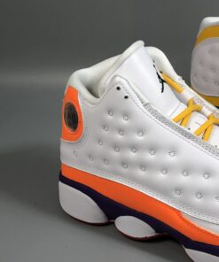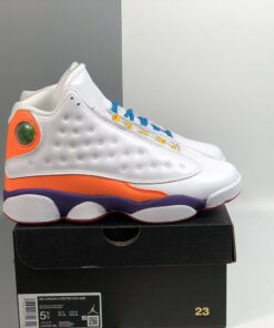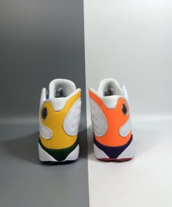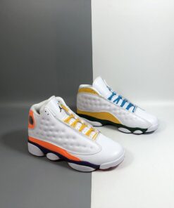 Dressed in a White, Black, Court Purple, and Total Orange color scheme. This Air Jordan 13 features a White-based upper on both shoes, while the right is accented in Orange and Purple with Yellow laces, and the left highlighted in Yellow and Green with Blue laces. Both are completed with colorful outsole to complete the “Playground” theme.