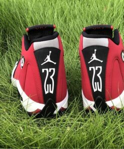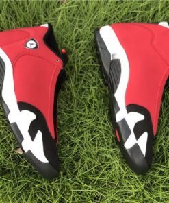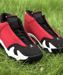 Dressed in a Black, Gym Red, White, and Off White colors scheme. This Air Jordan 14 features a Red upper with Black detailing on the toe box, sock liner, and heel completed with Off-White covering the midsole.