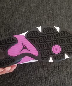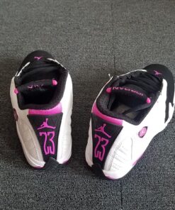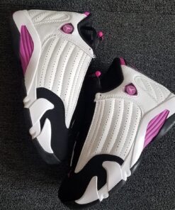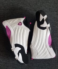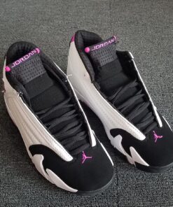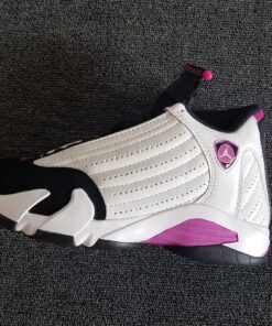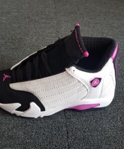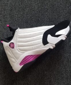 This Air Jordan 14 comes dressed in a White, Fuchsia Blast and Black color combination. As you can see it features similar color blocking to that of the iconic ‘Black Toe’ release. Utilizing White leather across the uppers, Black is then placed on the toe, tongue, laces, liner and outsole. Completing the look is Fuchsia Blast which is accented throughout.