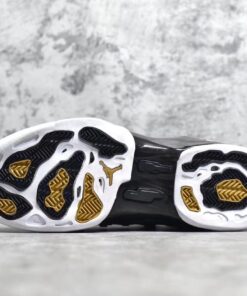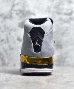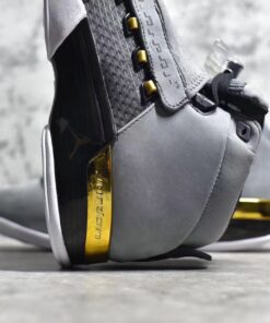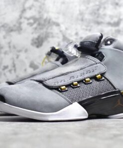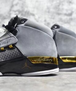 The Trophy Room x Air Jordan 17 Retro starts with a Cool Grey suede upper, one of the most popular colors in the line’s history. Hits of metallic gold and black give the retro somewhat of a luxury look and celebrates the shop’s general championship aesthetic. At the time of the silhouette’s original release in 2002, the 17 was hailed as a technically advanced performance shoe, featuring Jordan’s first Blow-Molded Air system, a full-length composite shank plate, and TPU heel stabilizer. Those features are packed into a grey suede build, which extends to the removable midfoot cover that conceals the black laces underneath. More black appears on the midsole, lining, and tongue, while the heel counter is coated in metallic gold, enhancing the shoe’s luxury aesthetic.