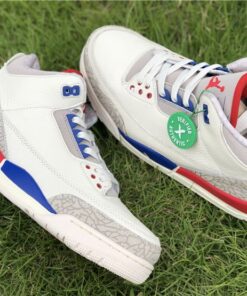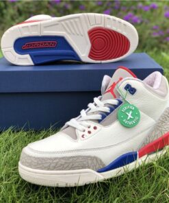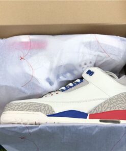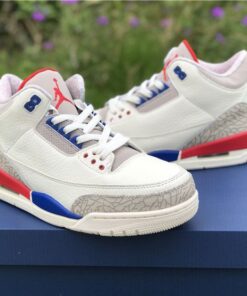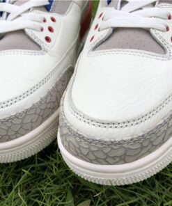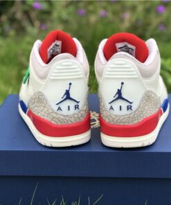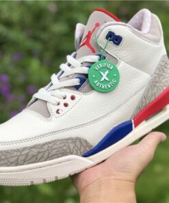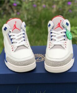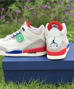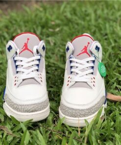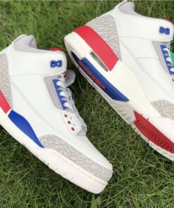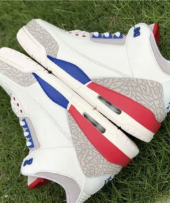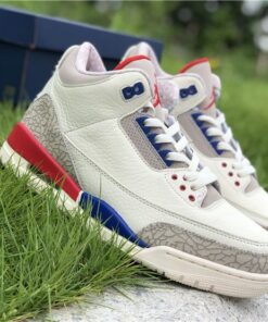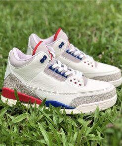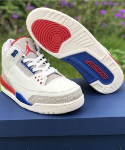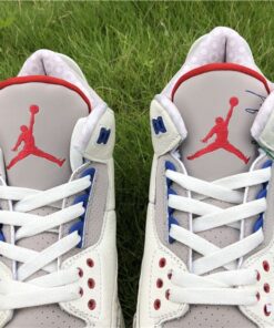 Dressed in a Sail, Sport Royal, Light Bone and Fire Red color scheme. This Air Jordan 3 follows from the uniform he wore in the game, adopting the original Fire Red color blocking. Finishing details include MJ’s signature on the left tongue and Grey elephant print on the toe.