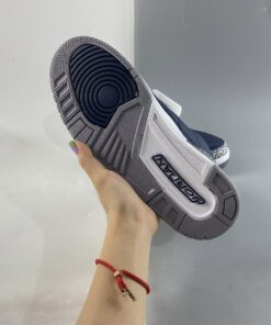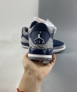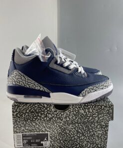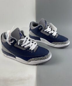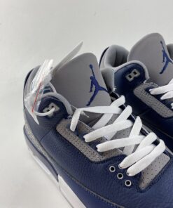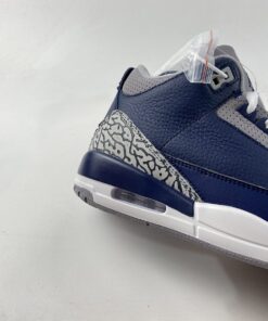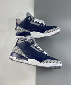 Dressed in a Midnight Navy, Cement Grey, and White color scheme. This Air Jordan 3 features a Navy tumbled leather base with Cement Grey overlays atop a White midsole and signature Grey-colored rubber sole.