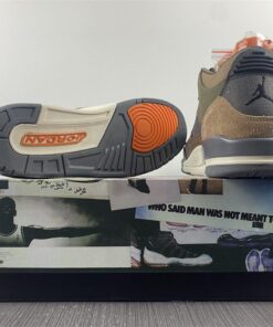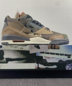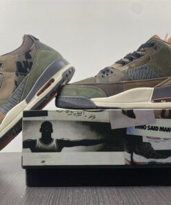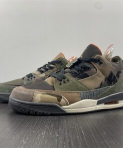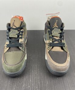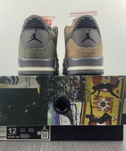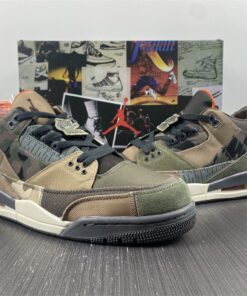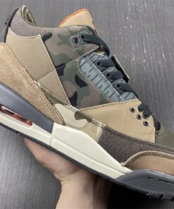 Taking inspiration from vintage surplus stores and fabrics, the upper of this Air Jordan 3 features three different camo patterns (woodland, rain, and oak bark), as well as waxed canvas, herringbone, wool, and twill materials. To complete the DIY look, the heel tabs are completely covered in hook and loop material so you can interchange Nike Air and Jumpman logo patches.