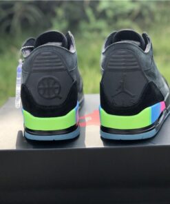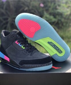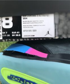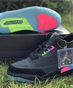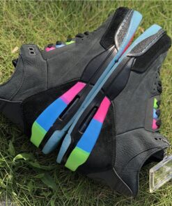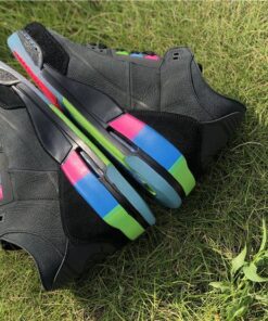 Dressed in a Black, Electric Green and Infrared 23 color scheme. It feature a Black premium tumbled leather upper with Black suede overlays. Pink, Blue and and Lime Green accents are used on the eyelets and midsole atop a Blue translucent outsole.