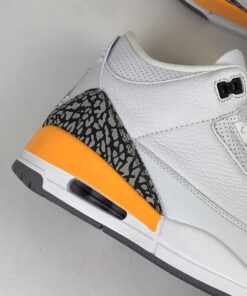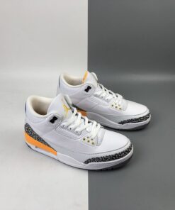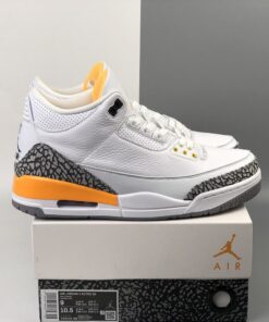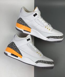 Dressed in a White, Laser Orange, Cement Grey, and Black color scheme. This Air Jordan 3 features a White tumbled leather upper with hits of Laser Orange throughout the sockliner, eyelets and midsole. Incorporating iconic elephant print on the toe and heel, this iteration is completed by a Laser Orange Jumpman “Air” hangtag.