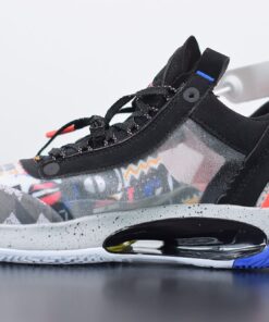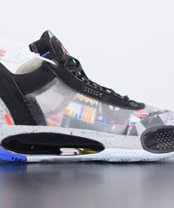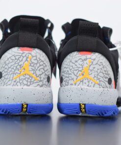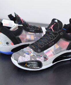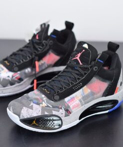 Dressed in a Black, Laser Orange, and White color scheme. This low-top Air Jordan 34 is highlighted with an abstract pattern that resembles the Air Jordan 7 as well as elephant print in the rear and cement print used on the midsole from both the Air Jordan 3 and Air Jordan 4, respectively. A Red Jumpman on the tongue with an Orange Jumpman on the heel atop a White rubber sole completes the design.