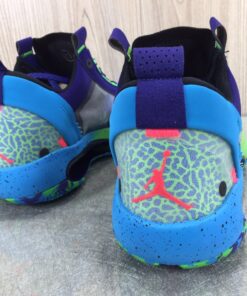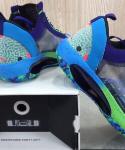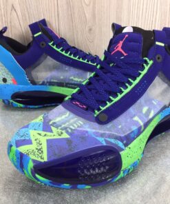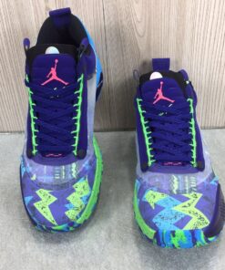 Dressed in a Regency Purple, Rage Green, Persian Violet, and Flash Crimson color scheme. This low-top Air Jordan XXXIV has a vibrant pattern similar to the “Bel-Air” Air Jordan 5 releases that extends onto its rubber outsole.