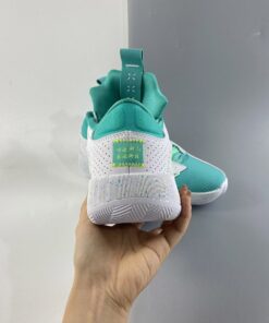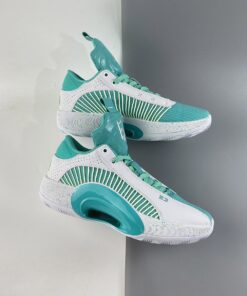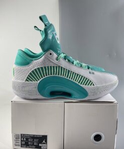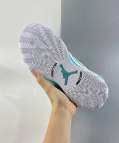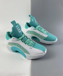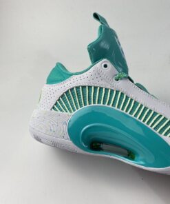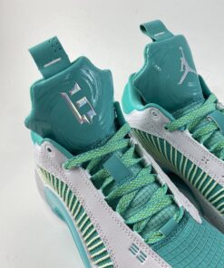 This offering of the low-top Air Jordan XXXV is mostly covered in a Jade Green color constructed in mesh while having White smooth leather overlay up front and perforated leather in the rear. Hints of Volt appear on the laces, speckled midsole, Cantonese characters on the heels, and insoles. Finishing off the design is Guo’s signature “G” on the right tongue atop a White rubber outsole.
