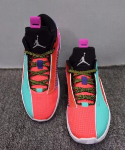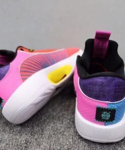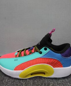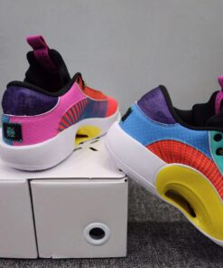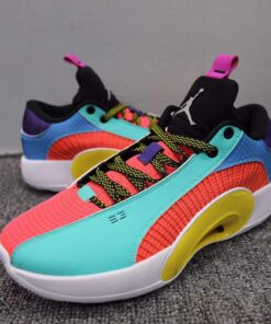 Dressed in a Multi-Color color scheme nodding to the zone therapy color chart. This low-top Air Jordan 35 features a Bright Red mesh base with suede overlays in Aqua and Blue on the lateral, and Orange and Pink on the medial. Other details includes 3M reflective hints, Purple mesh in the rear, Yellow Eclipse plate atop a White rubber sole. Kanji symbols on the heels with vibrant-colored graphic insoles resembling the foot chart completes the design.