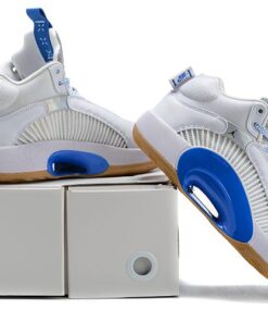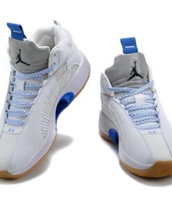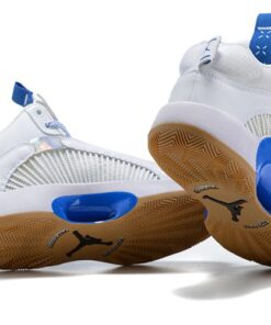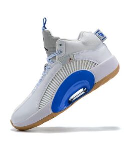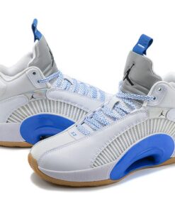 Dressed in a White, Black, Hyper Royal, and Gum Medium Brown color scheme. This Air Jordan XXXV features a White-based upper constructed in a mix of leather and mesh highlighted with iridescent detailing and Royal Blue accents. Silver tongues, “Nike Air” heel tabs, graphic Sisterhood-themed insoles atop a Gum rubber outsole completes the design.
