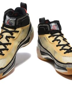 The sneaker features a Pale Vanilla Lenoweave upper with design elements inspired by his tattoos seen on the mudguard and tongue of the sneaker. The tongue also features the Jumpman and Jayson’s JT logo respectively on each shoe with a black nubuck ankle collar and heel counter which utilizes a Huarache-style bootie system. The black and Pale Vanilla midsole utilize Formula 23 foam with a double-stacked forefoot Zoom strobel setup. Lastly, a multidirectional gum outsole finishes off the sneaker.