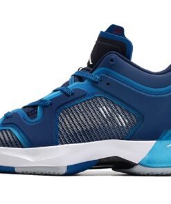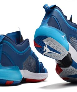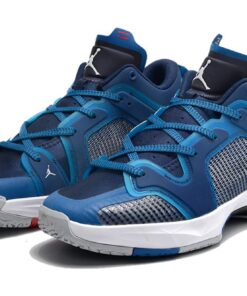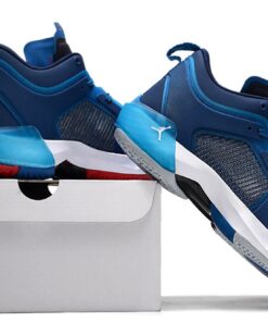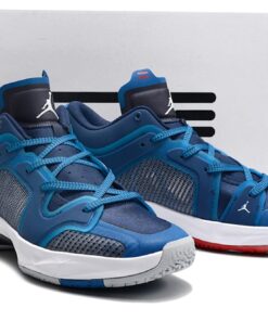 Tonally inspired by its Air Jordan 4 counterpart, a clad wash of “Military Blue” consumes the entirety of the upper while a faded “Midnight Navy” fills the mid-foot windows, tongue construction and sock liner. Featuring the same sequence of Greek letters that appeared on the latter collection’s heel insignia, its white and blue crest renders a singular appearance atop the left tongue in place of its typical Jumpman logo. Indulging in a seldom crimson accent atop the tongue and vertical pull tab in further homage to the AJ 4, a crisp white midsole unit and semi-translucent icy blue heel counter pairs with sectioned grey embellishments along the tread underfoot
