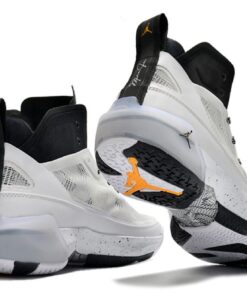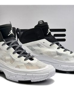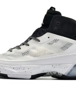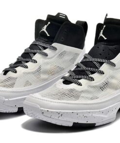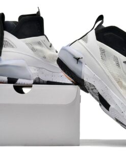 The white upper is made up of Levoweave which brings breathability without sacrificing strength with an exoskeleton built into the upper to bring more support. The Huarache-style bootie system is utilized in black with the Jumpman seen on the tongue in white. Going into the speckled midsole, Jordan Brands’ proprietary Formula 23 foam is used in the heel with double-stacked Zoom featured in the forefoot with a shank plate utilized for rigidity. Lastly, the outsole takes design inspiration once again from the AJ 7 with different patterns featured throughout in black and white.