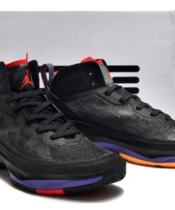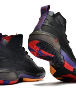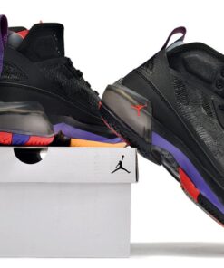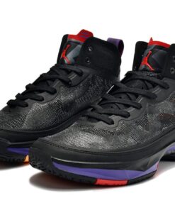 Like the other more recent Air Jordan models, this colorway of the Air Jordan 37 takes after the “Raptor” colorway of the Air Jordan 7, using a black base with red and purple accents throughout. The black upper is made up of Levoweave which brings breathability without sacrificing strength with an exoskeleton built into the upper to bring more support. The Huarache-style bootie system is utilized with the geometric print seen on the tongue alongside the Jumpman. Going into the midsole, Jordan Brands’ proprietary Formula 23 foam is used in the heel with double-stacked Zoom featured in the forefoot with a shank plate utilized for rigidity. Lastly, the outsole takes design inspiration once again from the AJ 7 with different patterns featured throughout.