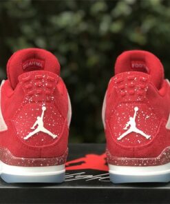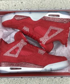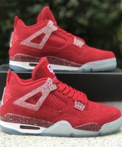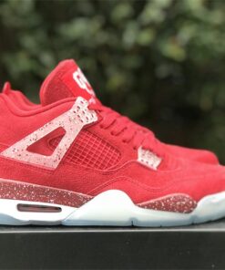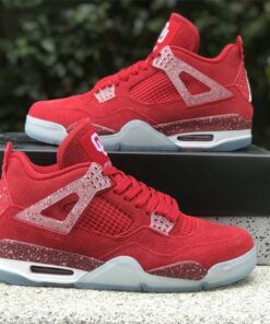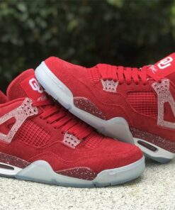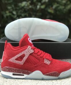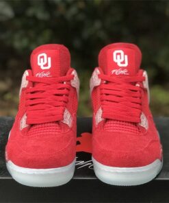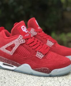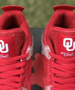 This Air Jordan 4 features a Red upper with translucent lace wings, speckled detailing atop a White midsole and icy outsole. Oklahoma Sooners branding appears on the tongue labels with Jumpman logos on the heels.