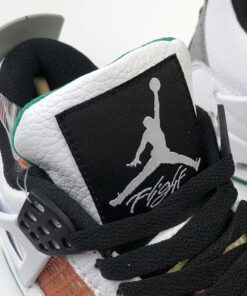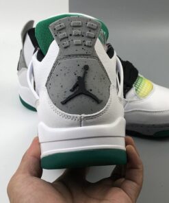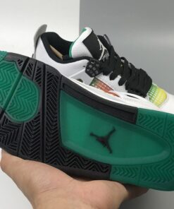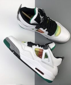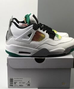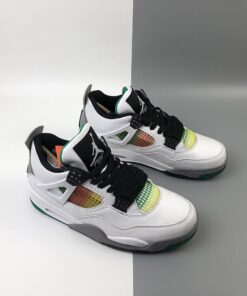Dressed in a White, University Red, Lucid Green, and Black color scheme. This Air Jordan 4 features a White tumbled leather upper with Rasta colors across the netting. Black detailing, cement print atop a Green and Black outsole completes the design.
