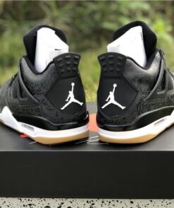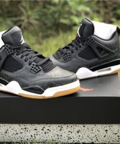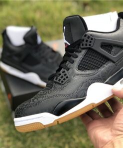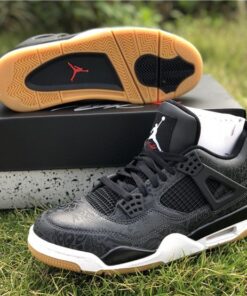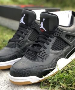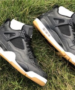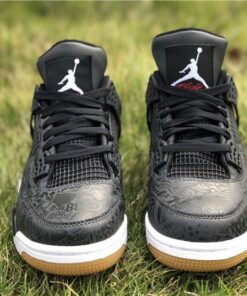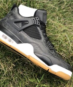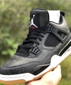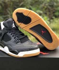Dressed in a Black, White, and Gum Light Brown color scheme. This Air Jordan 4 features a Black leather upper with 3M laser graphics. Red hits are seen on the “Flight” of the tongue and Jumpman logo on the outsole, while having White Jumpman logos on the tongue label and heel. A White midsole and Gum rubber outsole completes the design.
