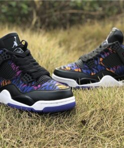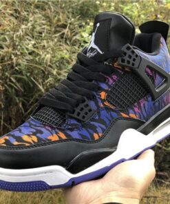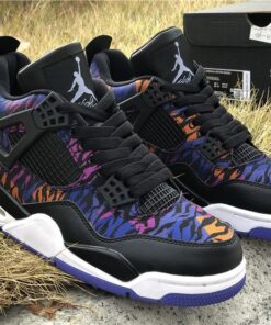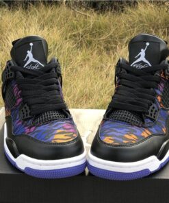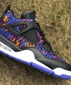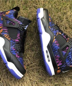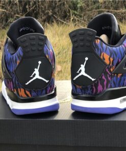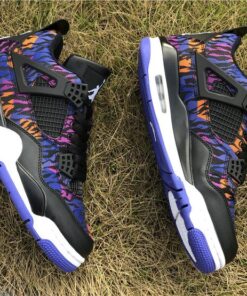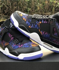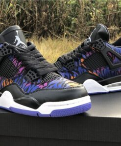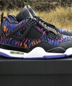 Dressed in a Black, White, Rush Violet, and Racer Blue color scheme. This Air Jordan 4 features a tiger-striped canvas upper in a mix of Blue, Purple, and Orange hues. A White Jumpman on the Black leather tongues and heels atop a matching White midsole and Blue rubber outsole completes the design.