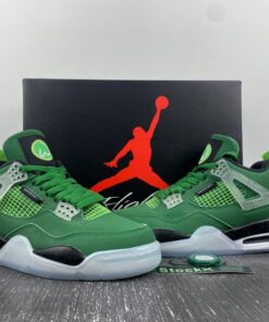 This celebrity duo has led to a number of Wahlberg-inspired Jordan PEs stemming from the family’s Wahlburgers franchise as well as the actor’s participation in the Transformers film series. Last year, Wahlburgers received its own trio of Jordan Formula 23 trainers, and now – in advance of its 30th anniversary celebration – the Boston-native took to IG to flaunt a pair of green and black Jordan 4s. Equipped with the burger joints signature “W” logo on its tongue, other details include an array of green shades, translucent eyelets and a matching outsole, and an attractive paint splatter print on its black midsole. A