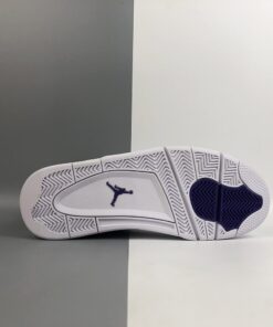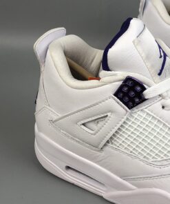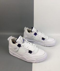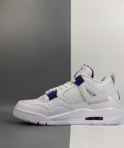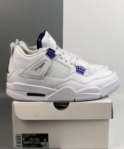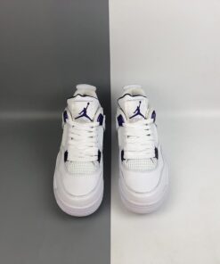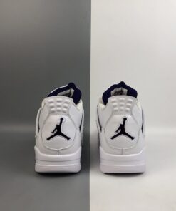 Each Air Jordan 4 features a White leather upper highlighted in Purple Metallic, Green Metallic, Red Metallic, and Orange Metallic detailing on the upper eyelets. A solid White rubber sole completes the design.