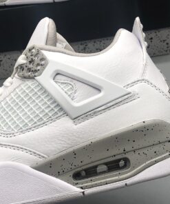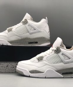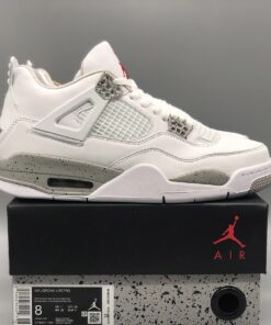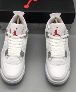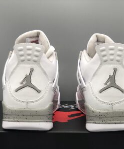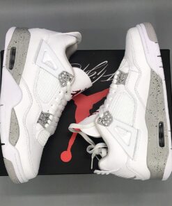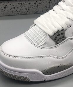 Dressed in a mix of White, Tech Grey, Black, and Fire Red. This Air Jordan 4 features an all-White tumbled leather upper detailed with speckled Cement Grey on the plastic eyelets and midsole. A solid Grey Jumpman on the heel, Red Jumpman logos on the tongues, insole and outsole atop a White rubber sole completes the design.
