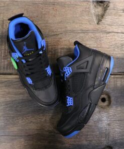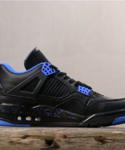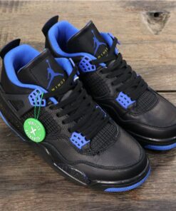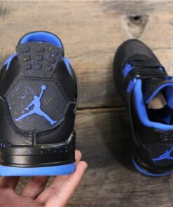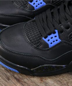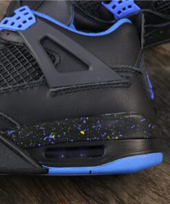 The shoe features an all-Black leather upper paired with Blue contrasting accents throughout and splatted detailing on the midsole and heels. Additional details includes a Blue Jumpman on the tongues with “WINGS” underneath in Gold.